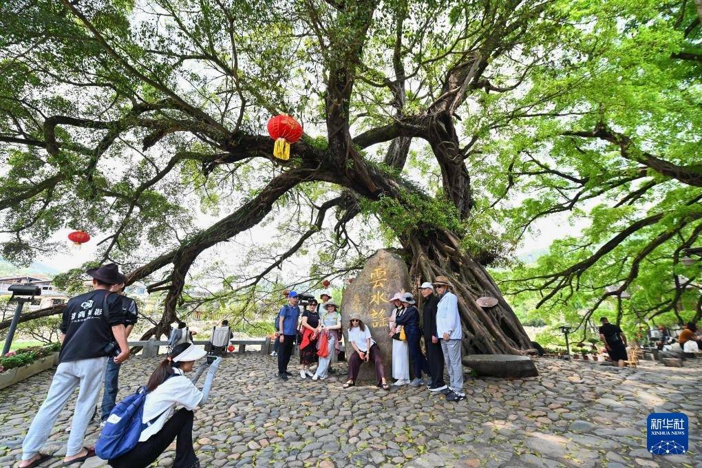 4月9日,游客在福建省漳州市南靖县梅林镇云水谣古镇的榕树下拍照。