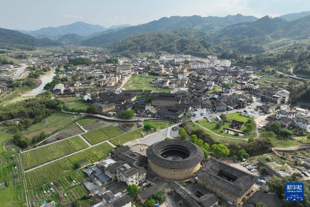 这是4月10日拍摄的位于福建省漳州市华安县仙都镇大地村的二宜楼及周边景色(无人机照片)。